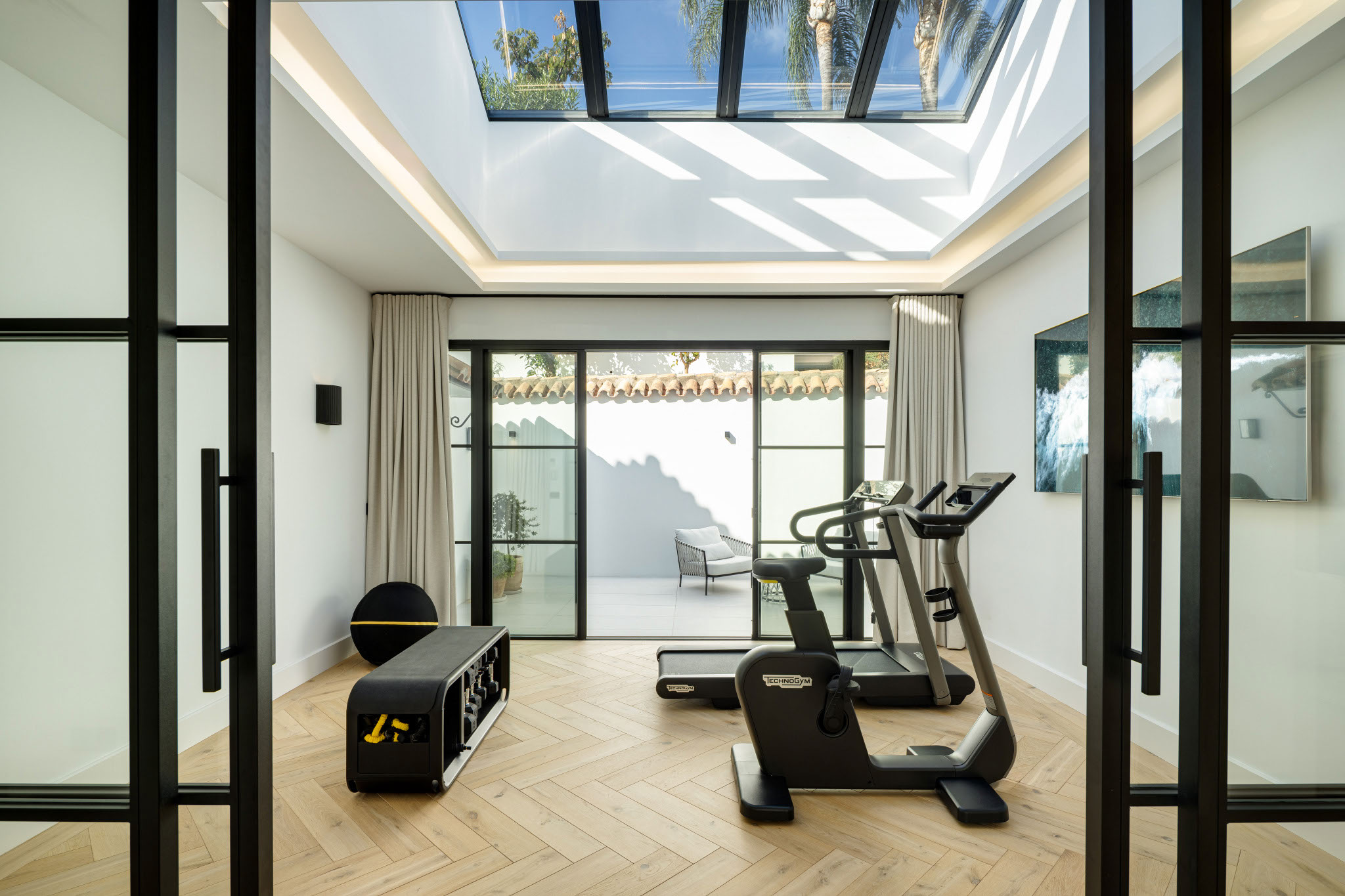 Wyjątkowym udogodnieniem jest siłownia Technogym ze szklanym, elektrycznie otwieranym dachem, umożliwiająca treningi pod gołym niebem. Willa oferuje także garaż z ładowarką do samochodów elektrycznych oraz zaawansowane systemy bezpieczeństwa, w tym kamery Target, monitoring 24/7 i kontrolowany dostęp do prywatnej urbanizacji.