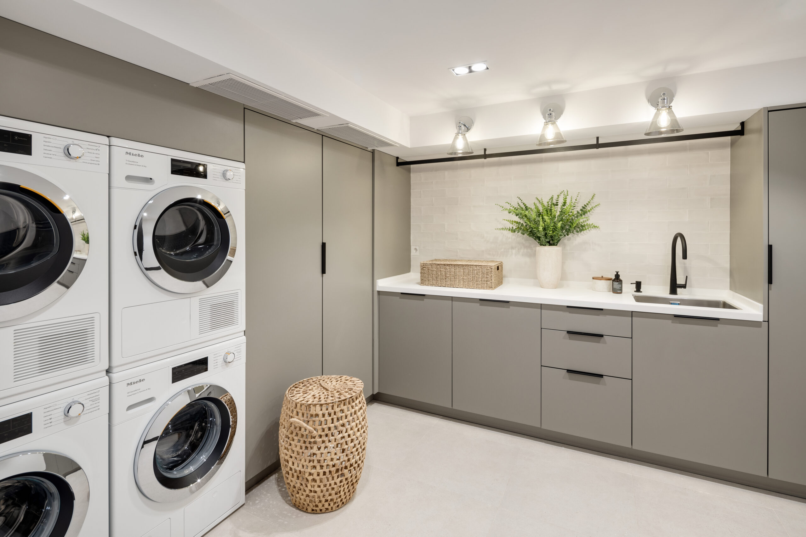 Wnętrza willi zachwycają elegancją i dopracowanym detalem. Jasne, kremowe posadzki Crema Sara oraz subtelna, naturalna kolorystyka wprowadzają spokój i harmonię. Charakterystyczny, trójkątny kształt dachu powtórzony został w strefie dziennej, tworząc wrażenie przestrzeni i lekkości. Salon i jadalnia łączą się z kuchnią wykonaną na zamówienie, w której zastosowano najwyższej klasy sprzęt AGD, przestronne blaty i przemyślane rozwiązania funkcjonalne.